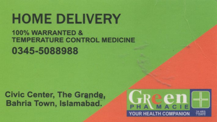 Green Pharmacy Green Pharmacy Pharmacy 03455088988 03455*** show Civic Center, The Grande Bahria Town, Islamabad. Save Submit Review Share Share This Post: facebook twitter linkedin google pinterest Photos Description 100 % Warranted & Temperature Control Medicine. Add Review & Rate Reply comment Cancel replyName Email Save my name, email, and website in this browser for the next time I comment. Be the first to review “Green Pharmacy” Cancel reply Quality Location Service Price Name Email Save my name, email, and website in this browser for the next time I comment. Review Drop images to upload or Gallery Images Maps Map Get Directions Listing Amenities Car Parking Close Business Info Get Directions Civic Center, The Grande Bahria Town, Islamabad. 03455088988 03455*** show Today Open MondayOpen All DayTuesdayOpen All DayWednesdayOpen All DayThursdayOpen All DayFridayOpen All DaySaturdayOpen All DaySundayOpen All Day Nearby listings Find more Pharmacy near Green Pharmacy Browse Nearby Bakeries Boutiques & Tailors Cash & Carry Cosmetic Education Electronics Eye Fast Food Garments General Store Hardware & Sanitary Health Clinics Home Services Jewelry Meat Shops Mobiles and Computers Optics Real Estate Services Shopping Spa & Saloon Sports & Stationery Travel & Tour Show all Statistic 1260 Views May 18, 2023