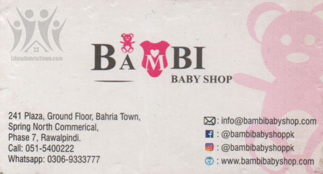 Bambi Baby Shop Bambi Garments 03069333777 03069*** show 241 plaza, Ground floor, Bahria Town, Spring North Commercial, ph-7 Rawalpindi. Save Submit Review Share Share This Post: facebook twitter linkedin google pinterest Photos Description At BAMBI BABY SHOP our aim is bringing joy to kids and smile on parents’ faces. Let’s be Kids. Add Review & Rate Reply comment Cancel replyName Email Save my name, email, and website in this browser for the next time I comment. Be the first to review “Bambi Baby Shop” Cancel reply Quality Location Service Price Name Email Save my name, email, and website in this browser for the next time I comment. Review Drop images to upload or Gallery Images Maps Map Get Directions Listing Amenities Accepts Credit Cards Bike Parking Car Parking Security Cameras Close Business Info Get Directions 241 plaza, Ground floor, Bahria Town, Spring North Commercial, ph-7 Rawalpindi. 03069333777 03069*** show info@bambibabayshop.com bambibabayshop.com Today Open MondayOpen All DayTuesdayOpen All DayWednesdayOpen All DayThursdayOpen All DayFridayOpen All DaySaturdayOpen All DaySundayOpen All Day Nearby listings Find more Garments near Bambi Baby Shop Browse Nearby Bakeries Boutiques & Tailors Cash & Carry Cosmetic Education Electronics Eye Fast Food General Store Hardware & Sanitary Health Clinics Home Services Jewelry Meat Shops Mobiles and Computers Optics Pharmacy Real Estate Services Shopping Spa & Saloon Sports & Stationery Travel & Tour Show all Statistic 264 Views May 18, 2023