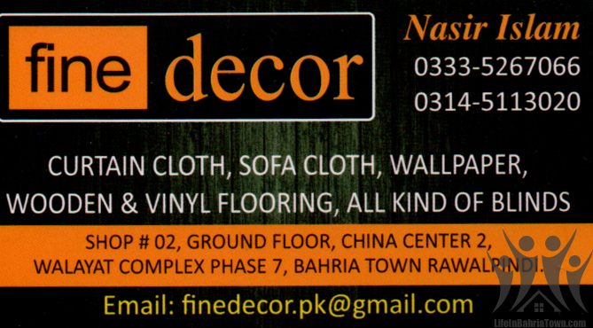 Fine Decor Nasir Islam Home Services 03335267066 03335*** show Shop#2, Ground Floor, China Centre 2, Wallayat Complex, Phase 7 Bahria Town, , Rawalpindi. Save Submit Review Share Share This Post: facebook twitter linkedin google pinterest Photos Description Curtain Cloth, Sofa Cloth, Wallpaper, Wooden & Vinly Flooring, All kind of blinds. Add Review & Rate Reply comment Cancel replyName Email Save my name, email, and website in this browser for the next time I comment. Be the first to review “Fine Decor” Cancel reply Quality Location Service Price Name Email Save my name, email, and website in this browser for the next time I comment. Review Drop images to upload or Gallery Images Maps Map Get Directions Close Business Info Get Directions Shop#2, Ground Floor, China Centre 2, Wallayat Complex, Phase 7 Bahria Town, , Rawalpindi. 03335267066 03335*** show finedecor.pk@gmail.com Today Open MondayOpen All DayTuesdayOpen All DayWednesdayOpen All DayThursdayOpen All DayFridayOpen All DaySaturdayOpen All DaySundayOpen All Day Nearby listings Find more Home Services near Fine Decor Browse Nearby Bakeries Boutiques & Tailors Cash & Carry Cosmetic Education Electronics Eye Fast Food Garments General Store Hardware & Sanitary Health Clinics Jewelry Meat Shops Mobiles and Computers Optics Pharmacy Real Estate Services Shopping Spa & Saloon Sports & Stationery Travel & Tour Show all Statistic 129 Views May 18, 2023