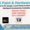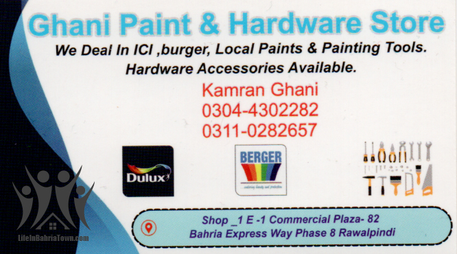 Ghani Paint & Hardware Store Kamran Ghani Hardware & Sanitary 03044302282 03044*** show Shop_1 E-1, Commercial Plaza-82 Bahria Express way Phase 8, Rwp. Save Submit Review Share Share This Post: facebook twitter linkedin google pinterest Photos Description We Deal in ICI, burger, Local Paints & Painting Tools. Hardware Accessories Available. Add Review & Rate Reply comment Cancel replyName Email Save my name, email, and website in this browser for the next time I comment. Be the first to review “Ghani Paint & Hardware Store” Cancel reply Quality Location Service Price Name Email Save my name, email, and website in this browser for the next time I comment. Review Drop images to upload or Gallery Images Maps Map Get Directions Close Business Info Get Directions Shop_1 E-1, Commercial Plaza-82 Bahria Express way Phase 8, Rwp. 03044302282 03044*** show Today Open MondayOpen All DayTuesdayOpen All DayWednesdayOpen All DayThursdayOpen All DayFridayOpen All DaySaturdayOpen All DaySundayOpen All Day Nearby listings Find more Hardware & Sanitary near Ghani Paint & Hardware Store Browse Nearby Bakeries Boutiques & Tailors Cash & Carry Cosmetic Education Electronics Eye Fast Food Garments General Store Health Clinics Home Services Jewelry Meat Shops Mobiles and Computers Optics Pharmacy Real Estate Services Shopping Spa & Saloon Sports & Stationery Travel & Tour Show all Statistic 159 Views May 18, 2023