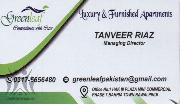 Green Leaf Tanveer Riaz Real Estate 03175656480 03175*** show Office no.1 HAK 3 Plaza Mini Commercial Ph-7 Bahria Town Rawalpindi. Save Submit Review Share Share This Post: facebook twitter linkedin google pinterest Photos Description We have luxury & Furnished Apartments. Add Review & Rate Reply comment Cancel replyName Email Save my name, email, and website in this browser for the next time I comment. Be the first to review “Green Leaf” Cancel reply Quality Location Service Price Name Email Save my name, email, and website in this browser for the next time I comment. Review Drop images to upload or Gallery Images Maps Map Get Directions Close Business Info Get Directions Office no.1 HAK 3 Plaza Mini Commercial Ph-7 Bahria Town Rawalpindi. 03175656480 03175*** show graanleafpakistan@gmail.com Today Open MondayOpen All DayTuesdayOpen All DayWednesdayOpen All DayThursdayOpen All DayFridayOpen All DaySaturdayOpen All DaySundayOpen All Day Nearby listings Find more Real Estate near Green Leaf Browse Nearby Bakeries Boutiques & Tailors Cash & Carry Cosmetic Education Electronics Eye Fast Food Garments General Store Hardware & Sanitary Health Clinics Home Services Jewelry Meat Shops Mobiles and Computers Optics Pharmacy Services Shopping Spa & Saloon Sports & Stationery Travel & Tour Show all Statistic 139 Views May 18, 2023