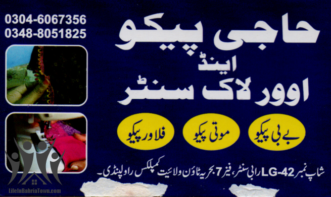 Haji Pico & Over Lock Centre Haji Pico Boutiques & Tailors 03046067356 03046*** show Shop# LG-42, Rabi Centre, Phase 7, Bahria Town, Wallayat Complex Rwp. Save Submit Review Share Share This Post: facebook twitter linkedin google pinterest Photos Description Baby Pico and different kind of pico is available. Add Review & Rate Reply comment Cancel replyName Email Save my name, email, and website in this browser for the next time I comment. Be the first to review “Haji Pico & Over Lock Centre” Cancel reply Quality Location Service Price Name Email Save my name, email, and website in this browser for the next time I comment. Review Drop images to upload or Gallery Images Maps Map Get Directions Close Business Info Get Directions Shop# LG-42, Rabi Centre, Phase 7, Bahria Town, Wallayat Complex Rwp. 03046067356 03046*** show Today Open MondayOpen All DayTuesdayOpen All DayWednesdayOpen All DayThursdayOpen All DayFridayOpen All DaySaturdayOpen All DaySundayOpen All Day Nearby listings Find more Boutiques & Tailors near Haji Pico & Over Lock Centre Browse Nearby Bakeries Cash & Carry Cosmetic Education Electronics Eye Fast Food Garments General Store Hardware & Sanitary Health Clinics Home Services Jewelry Meat Shops Mobiles and Computers Optics Pharmacy Real Estate Services Shopping Spa & Saloon Sports & Stationery Travel & Tour Show all Statistic 122 Views May 18, 2023
