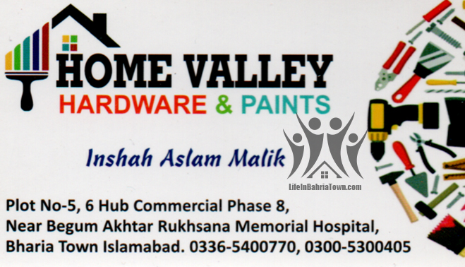 Home Valley Hardware & Paints Inshah Aslam Malik Services 03365400770 03365*** show Plot #5,6 Hub Commercial Phase 8, Near Begum Akhtar Rukhsana Memorial Hospital, Bahria Town Islamabad. Save Submit Review Share Share This Post: facebook twitter linkedin google pinterest Photos Description Deals in Sanitary, Electric & Hardware. Add Review & Rate Reply comment Cancel replyName Email Save my name, email, and website in this browser for the next time I comment. Be the first to review “Home Valley Hardware & Paints” Cancel reply Quality Location Service Price Name Email Save my name, email, and website in this browser for the next time I comment. Review Drop images to upload or Gallery Images Maps Map Get Directions Close Business Info Get Directions Plot #5,6 Hub Commercial Phase 8, Near Begum Akhtar Rukhsana Memorial Hospital, Bahria Town Islamabad. 03365400770 03365*** show Today Open MondayOpen All DayTuesdayOpen All DayWednesdayOpen All DayThursdayOpen All DayFridayOpen All DaySaturdayOpen All DaySundayOpen All Day Nearby listings Find more Services near Home Valley Hardware & Paints Browse Nearby Bakeries Boutiques & Tailors Cash & Carry Cosmetic Education Electronics Eye Fast Food Garments General Store Hardware & Sanitary Health Clinics Home Services Jewelry Meat Shops Mobiles and Computers Optics Pharmacy Real Estate Shopping Spa & Saloon Sports & Stationery Travel & Tour Show all Statistic 132 Views May 18, 2023