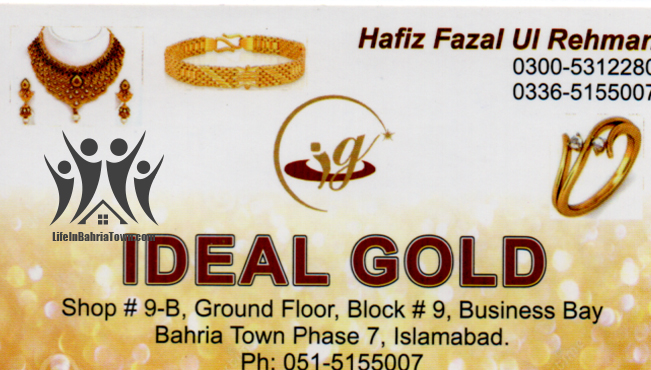 Ideal Gold Hafiz Fazal Ul Rehman Jewelry 03005312280 03005*** show Shop#9-B, Ground Floor, Block#9, Business Bay Bahria Town Phase 7, Islamabad. Save Submit Review Share Share This Post: facebook twitter linkedin google pinterest Photos Description · Nose Pin · Bangles · Bracelets · Bridal Sets · Chains · Earrings · Gold Coins · Kara’s. All designs are available. Add Review & Rate Reply comment Cancel replyName Email Save my name, email, and website in this browser for the next time I comment. Be the first to review “Ideal Gold” Cancel reply Quality Location Service Price Name Email Save my name, email, and website in this browser for the next time I comment. Review Drop images to upload or Gallery Images Maps Map Get Directions Listing Amenities Bike Parking Car Parking Close Business Info Get Directions Shop#9-B, Ground Floor, Block#9, Business Bay Bahria Town Phase 7, Islamabad. 03005312280 03005*** show Today Open MondayOpen All DayTuesdayOpen All DayWednesdayOpen All DayThursdayOpen All DayFridayOpen All DaySaturdayOpen All DaySundayOpen All Day Nearby listings Find more Jewelry near Ideal Gold Browse Nearby Bakeries Boutiques & Tailors Cash & Carry Cosmetic Education Electronics Eye Fast Food Garments General Store Hardware & Sanitary Health Clinics Home Services Meat Shops Mobiles and Computers Optics Pharmacy Real Estate Services Shopping Spa & Saloon Sports & Stationery Travel & Tour Show all Statistic 179 Views May 18, 2023