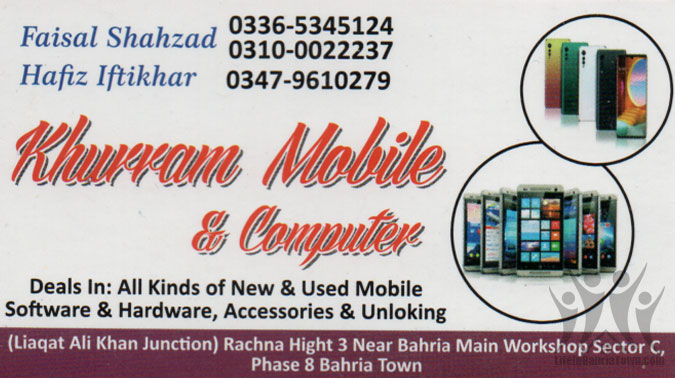 khurram Mobile & Computer Faisal Shahzad Mobiles and Computers 03365345124 03365*** show Bahria Town, Phase 8, Rawalpindi Save Submit Review Share Share This Post: facebook twitter linkedin google pinterest Photos Description All kinds of new and used Mobile Software & Hardware, Accessories & Unloking Add Review & Rate Reply comment Cancel replyName Email Save my name, email, and website in this browser for the next time I comment. Be the first to review “khurram Mobile & Computer” Cancel reply Quality Location Service Price Name Email Save my name, email, and website in this browser for the next time I comment. Review Drop images to upload or Gallery Images Maps Map Get Directions Close Business Info Get Directions Bahria Town, Phase 8, Rawalpindi 03365345124 03365*** show Today Open 10:00 am - 12:00 am Monday10:00 am - 12:00 amTuesday10:00 am - 12:00 amWednesday10:00 am - 12:00 amThursday10:00 am - 12:00 amFriday10:00 am - 12:00 amSaturday10:00 am - 12:00 amSunday10:00 am - 12:00 am Nearby listings Find more Mobiles and Computers near khurram Mobile & Computer Browse Nearby Bakeries Boutiques & Tailors Cash & Carry Cosmetic Education Electronics Eye Fast Food Garments General Store Hardware & Sanitary Health Clinics Home Services Jewelry Meat Shops Optics Pharmacy Real Estate Services Shopping Spa & Saloon Sports & Stationery Travel & Tour Show all Statistic 236 Views May 18, 2023