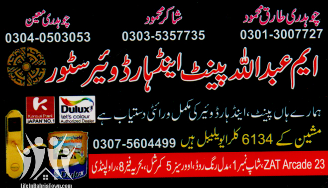 M. Abdullah Paint & Hardware Store CH. Tariq Mahmood Hardware & Sanitary 03013007727 03013*** show ZAT Arcade, Shop#1, Overseas 5 Commercial, Bahria Town Phase 8, Rwp. Save Submit Review Share Share This Post: facebook twitter linkedin google pinterest Photos Description We have all variety of paint and hardware. Add Review & Rate Reply comment Cancel replyName Email Save my name, email, and website in this browser for the next time I comment. Be the first to review “M. Abdullah Paint & Hardware Store” Cancel reply Quality Location Service Price Name Email Save my name, email, and website in this browser for the next time I comment. Review Drop images to upload or Gallery Images Maps Map Get Directions Close Business Info Get Directions ZAT Arcade, Shop#1, Overseas 5 Commercial, Bahria Town Phase 8, Rwp. 03013007727 03013*** show Today Open MondayOpen All DayTuesdayOpen All DayWednesdayOpen All DayThursdayOpen All DayFridayOpen All DaySaturdayOpen All DaySundayOpen All Day Nearby listings Find more Hardware & Sanitary near M. Abdullah Paint & Hardware Store Browse Nearby Bakeries Boutiques & Tailors Cash & Carry Cosmetic Education Electronics Eye Fast Food Garments General Store Health Clinics Home Services Jewelry Meat Shops Mobiles and Computers Optics Pharmacy Real Estate Services Shopping Spa & Saloon Sports & Stationery Travel & Tour Show all Statistic 436 Views May 18, 2023