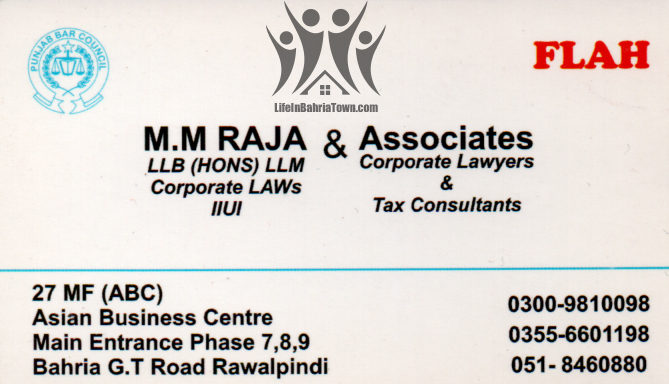 M.M Raja & Associates M.M Raja & Associates Services 03009810098 03009*** show Asian Business Centre, Main Entrance Phase 7,8,9 Bahria Town G.T Road Rawalpindi. Save Submit Review Share Share This Post: facebook twitter linkedin google pinterest Photos Description Cooperate lawyer and tax consultants. Add Review & Rate Reply comment Cancel replyName Email Save my name, email, and website in this browser for the next time I comment. Be the first to review “M.M Raja & Associates” Cancel reply Quality Location Service Price Name Email Save my name, email, and website in this browser for the next time I comment. Review Drop images to upload or Gallery Images Maps Map Get Directions Close Business Info Get Directions Asian Business Centre, Main Entrance Phase 7,8,9 Bahria Town G.T Road Rawalpindi. 03009810098 03009*** show Today Open MondayOpen All DayTuesdayOpen All DayWednesdayOpen All DayThursdayOpen All DayFridayOpen All DaySaturdayOpen All DaySundayOpen All Day Nearby listings Find more Services near M.M Raja & Associates Browse Nearby Bakeries Boutiques & Tailors Cash & Carry Cosmetic Education Electronics Eye Fast Food Garments General Store Hardware & Sanitary Health Clinics Home Services Jewelry Meat Shops Mobiles and Computers Optics Pharmacy Real Estate Shopping Spa & Saloon Sports & Stationery Travel & Tour Show all Statistic 214 Views May 18, 2023