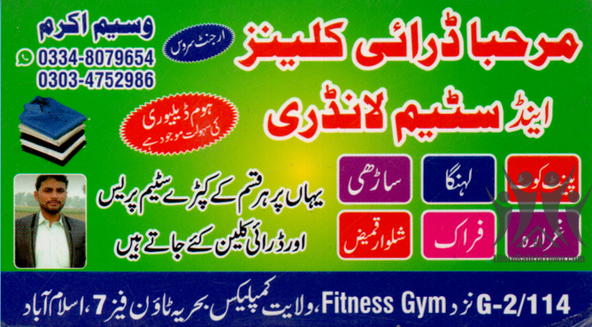 Marhaba Dry Cleaner And Steam Laundry Waseem Akram Services 03348079654 03348*** show G-2/114 near Gym , Wallayat Complex Bahria Town, Phase 7, Islamabad. Save Submit Review Share Share This Post: facebook twitter linkedin google pinterest Photos Description All kinds of clothes services are available. Add Review & Rate Reply comment Cancel replyName Email Save my name, email, and website in this browser for the next time I comment. Be the first to review “Marhaba Dry Cleaner And Steam Laundry” Cancel reply Quality Location Service Price Name Email Save my name, email, and website in this browser for the next time I comment. Review Drop images to upload or Gallery Images Maps Map Get Directions Close Business Info Get Directions G-2/114 near Gym , Wallayat Complex Bahria Town, Phase 7, Islamabad. 03348079654 03348*** show Today Open MondayOpen All DayTuesdayOpen All DayWednesdayOpen All DayThursdayOpen All DayFridayOpen All DaySaturdayOpen All DaySundayOpen All Day Nearby listings Find more Services near Marhaba Dry Cleaner And Steam Laundry Browse Nearby Bakeries Boutiques & Tailors Cash & Carry Cosmetic Education Electronics Eye Fast Food Garments General Store Hardware & Sanitary Health Clinics Home Services Jewelry Meat Shops Mobiles and Computers Optics Pharmacy Real Estate Shopping Spa & Saloon Sports & Stationery Travel & Tour Show all Statistic 146 Views May 18, 2023