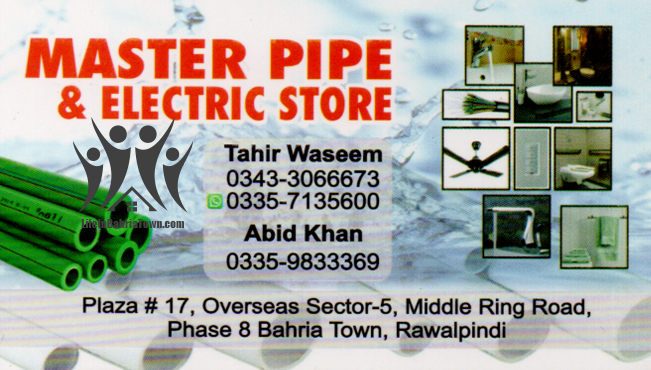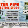 Master Pipe & Electric Store Tahir Waseem Services 03433066673 03433*** show Plaza # 17, Overseas sector 5, Middle Ring Road, Phase 8 Bahria Town, Rawalpindi. Save Submit Review Share Share This Post: facebook twitter linkedin google pinterest Photos Description Master Pipe is a leading pipe manufacturer in Pakistan and produces premium quality. Add Review & Rate Reply comment Cancel replyName Email Save my name, email, and website in this browser for the next time I comment. Be the first to review “Master Pipe & Electric Store” Cancel reply Quality Location Service Price Name Email Save my name, email, and website in this browser for the next time I comment. Review Drop images to upload or Gallery Images Maps Map Get Directions Close Business Info Get Directions Plaza # 17, Overseas sector 5, Middle Ring Road, Phase 8 Bahria Town, Rawalpindi. 03433066673 03433*** show Today Open MondayOpen All DayTuesdayOpen All DayWednesdayOpen All DayThursdayOpen All DayFridayOpen All DaySaturdayOpen All DaySundayOpen All Day Nearby listings Find more Services near Master Pipe & Electric Store Browse Nearby Bakeries Boutiques & Tailors Cash & Carry Cosmetic Education Electronics Eye Fast Food Garments General Store Hardware & Sanitary Health Clinics Home Services Jewelry Meat Shops Mobiles and Computers Optics Pharmacy Real Estate Shopping Spa & Saloon Sports & Stationery Travel & Tour Show all Statistic 140 Views May 18, 2023