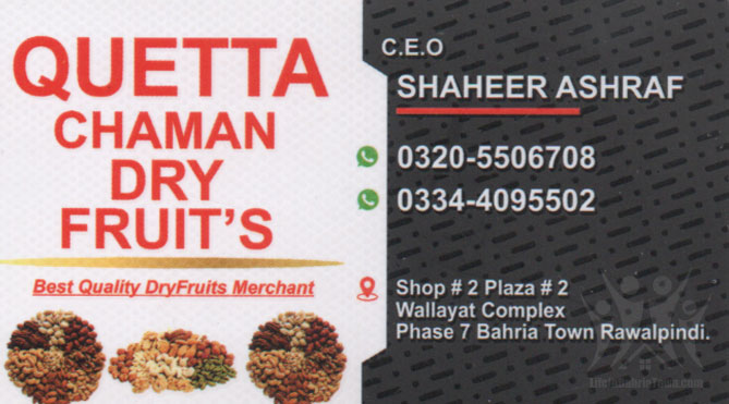Quetta Chaman Dry Fruits Shaheer Ashraf General Store 03205506708 03205*** show number 2, Wallayat Complex, shop number 2 plaza, Phase 7 bahria town, Rawalpindi, 46220, Pakistan Save Submit Review Share Share This Post: facebook twitter linkedin google pinterest Photos Description Best quality dry fruits merchant Add Review & Rate Reply comment Cancel replyName Email Save my name, email, and website in this browser for the next time I comment. Be the first to review “Quetta Chaman Dry Fruits” Cancel reply Quality Location Service Price Name Email Save my name, email, and website in this browser for the next time I comment. Review Drop images to upload or Gallery Images Maps Map Get Directions Close Business Info Get Directions number 2, Wallayat Complex, shop number 2 plaza, Phase 7 bahria town, Rawalpindi, 46220, Pakistan 03205506708 03205*** show Today Open 9:00 am - 11:00 pm Monday9:00 am - 11:00 pmTuesday9:00 am - 11:00 pmWednesday9:00 am - 11:00 pmThursday9:00 am - 11:00 pmFriday9:00 am - 11:00 pmSaturday9:00 am - 11:00 pmSunday9:00 am - 11:00 pm Nearby listings Find more General Store near Quetta Chaman Dry Fruits Browse Nearby Bakeries Boutiques & Tailors Cash & Carry Cosmetic Education Electronics Eye Fast Food Garments Hardware & Sanitary Health Clinics Home Services Jewelry Meat Shops Mobiles and Computers Optics Pharmacy Real Estate Services Shopping Spa & Saloon Sports & Stationery Travel & Tour Show all Statistic 325 Views May 18, 2023