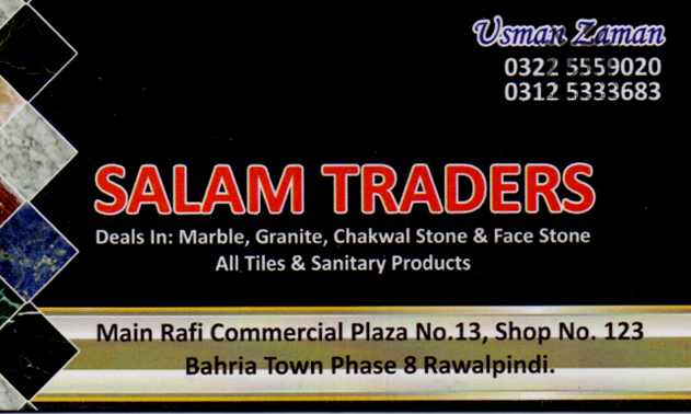 Salam Traders Usman Zaman Services 03225559020 03225*** show Main Rafi Commercial Plaza #13, Shop #123, Bahria Town Phase-8, Islamabad Save Submit Review Share Share This Post: facebook twitter linkedin google pinterest Photos Description We are here to serve you quality and reliable products. Add Review & Rate Reply comment Cancel replyName Email Save my name, email, and website in this browser for the next time I comment. Be the first to review “Salam Traders” Cancel reply Quality Location Service Price Name Email Save my name, email, and website in this browser for the next time I comment. Review Drop images to upload or Gallery Images Maps Map Get Directions Close Business Info Get Directions Main Rafi Commercial Plaza #13, Shop #123, Bahria Town Phase-8, Islamabad 03225559020 03225*** show Today Open MondayOpen All DayTuesdayOpen All DayWednesdayOpen All DayThursdayOpen All DayFridayOpen All DaySaturdayOpen All DaySundayOpen All Day Nearby listings Find more Services near Salam Traders Browse Nearby Bakeries Boutiques & Tailors Cash & Carry Cosmetic Education Electronics Eye Fast Food Garments General Store Hardware & Sanitary Health Clinics Home Services Jewelry Meat Shops Mobiles and Computers Optics Pharmacy Real Estate Shopping Spa & Saloon Sports & Stationery Travel & Tour Show all Statistic 252 Views May 18, 2023
