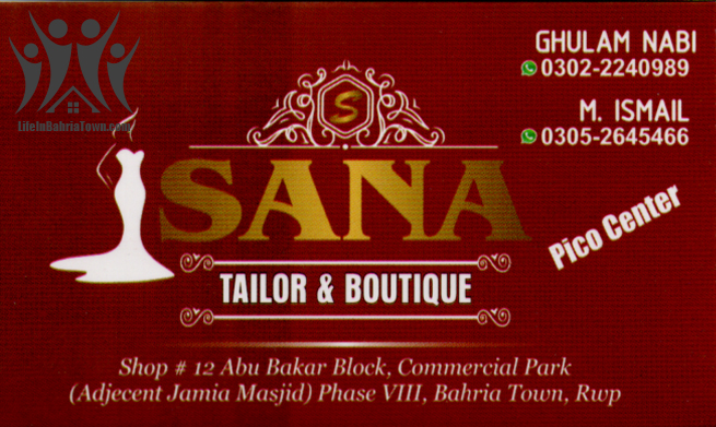 Sana Tailor & Boutique Ghulam Nabi Boutiques & Tailors 03022240989 03022*** show Shop# 12 Abu Bakar Block, Commercial Park ( Adjacent Jamia Masjid) Phase 8, Bahria Town, Rwp Save Submit Review Share Share This Post: facebook twitter linkedin google pinterest Photos Description All kind of dress specialist. Add Review & Rate Reply comment Cancel replyName Email Save my name, email, and website in this browser for the next time I comment. Be the first to review “Sana Tailor & Boutique” Cancel reply Quality Location Service Price Name Email Save my name, email, and website in this browser for the next time I comment. Review Drop images to upload or Gallery Images Maps Map Get Directions Close Business Info Get Directions Shop# 12 Abu Bakar Block, Commercial Park ( Adjacent Jamia Masjid) Phase 8, Bahria Town, Rwp 03022240989 03022*** show Today Open MondayOpen All DayTuesdayOpen All DayWednesdayOpen All DayThursdayOpen All DayFridayOpen All DaySaturdayOpen All DaySundayOpen All Day Nearby listings Find more Boutiques & Tailors near Sana Tailor & Boutique Browse Nearby Bakeries Cash & Carry Cosmetic Education Electronics Eye Fast Food Garments General Store Hardware & Sanitary Health Clinics Home Services Jewelry Meat Shops Mobiles and Computers Optics Pharmacy Real Estate Services Shopping Spa & Saloon Sports & Stationery Travel & Tour Show all Statistic 140 Views May 18, 2023