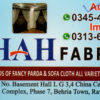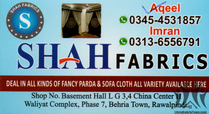 Shah Fabrics Aqeel Home Services 03454531857 03454*** show Shop # Basement Hall L-G 3,4 China Center 2, Wallayat Complex, Phase 7 Bahria Town, Rwp. Save Submit Review Share Share This Post: facebook twitter linkedin google pinterest Photos Description Deal in all kinds of fancy parda & sofa cloth, all variety available here. Add Review & Rate Reply comment Cancel replyName Email Save my name, email, and website in this browser for the next time I comment. Be the first to review “Shah Fabrics” Cancel reply Quality Location Service Price Name Email Save my name, email, and website in this browser for the next time I comment. Review Drop images to upload or Gallery Images Maps Map Get Directions Close Business Info Get Directions Shop # Basement Hall L-G 3,4 China Center 2, Wallayat Complex, Phase 7 Bahria Town, Rwp. 03454531857 03454*** show Today Open MondayOpen All DayTuesdayOpen All DayWednesdayOpen All DayThursdayOpen All DayFridayOpen All DaySaturdayOpen All DaySundayOpen All Day Nearby listings Find more Home Services near Shah Fabrics Browse Nearby Bakeries Boutiques & Tailors Cash & Carry Cosmetic Education Electronics Eye Fast Food Garments General Store Hardware & Sanitary Health Clinics Jewelry Meat Shops Mobiles and Computers Optics Pharmacy Real Estate Services Shopping Spa & Saloon Sports & Stationery Travel & Tour Show all Statistic 304 Views May 18, 2023