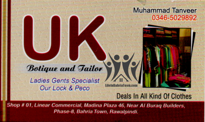 UK Boutique & Tailor Muhammad Tanveer Boutiques & Tailors 03465029892 03465*** show Shop#1, Linear Commercial, Madina Plaza 46, Near Al Buraq Builders, Ph-8, Bahria Town Rawalpindi. Save Submit Review Share Share This Post: facebook twitter linkedin google pinterest Photos Description Ladies Gents Specialist Our lock & Peco. Add Review & Rate Reply comment Cancel replyName Email Save my name, email, and website in this browser for the next time I comment. Be the first to review “UK Boutique & Tailor” Cancel reply Quality Location Service Price Name Email Save my name, email, and website in this browser for the next time I comment. Review Drop images to upload or Gallery Images Maps Map Get Directions Close Business Info Get Directions Shop#1, Linear Commercial, Madina Plaza 46, Near Al Buraq Builders, Ph-8, Bahria Town Rawalpindi. 03465029892 03465*** show Today Open MondayOpen All DayTuesdayOpen All DayWednesdayOpen All DayThursdayOpen All DayFridayOpen All DaySaturdayOpen All DaySundayOpen All Day Nearby listings Find more Boutiques & Tailors near UK Boutique & Tailor Browse Nearby Bakeries Cash & Carry Cosmetic Education Electronics Eye Fast Food Garments General Store Hardware & Sanitary Health Clinics Home Services Jewelry Meat Shops Mobiles and Computers Optics Pharmacy Real Estate Services Shopping Spa & Saloon Sports & Stationery Travel & Tour Show all Statistic 96 Views May 18, 2023