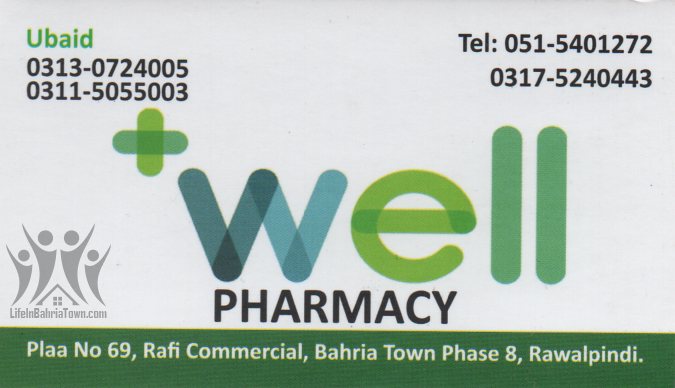 Well Pharmacy Ubaid Pharmacy 03175240443 03175*** show plaza no 69, Rafi commercial, Bahria Town Phase 8, Rawalpindi. Save Submit Review Share Share This Post: facebook twitter linkedin google pinterest Photos Description kind of multinational medicines. Add Review & Rate Reply comment Cancel replyName Email Save my name, email, and website in this browser for the next time I comment. Be the first to review “Well Pharmacy” Cancel reply Quality Location Service Price Name Email Save my name, email, and website in this browser for the next time I comment. Review Drop images to upload or Gallery Images Maps Map Get Directions Listing Amenities Accepts Credit Cards Bike Parking Security Cameras Close Business Info Get Directions plaza no 69, Rafi commercial, Bahria Town Phase 8, Rawalpindi. 03175240443 03175*** show Today Open 9:00 am - 10:00 pm Monday9:00 am - 10:00 pmTuesday9:00 am - 10:00 pmWednesday9:00 am - 10:00 pmThursday9:00 am - 10:00 pmFriday9:00 am - 10:00 pmSaturday9:00 am - 10:00 pmSunday9:00 am - 10:00 pm Nearby listings Find more Pharmacy near Well Pharmacy Browse Nearby Bakeries Boutiques & Tailors Cash & Carry Cosmetic Education Electronics Eye Fast Food Garments General Store Hardware & Sanitary Health Clinics Home Services Jewelry Meat Shops Mobiles and Computers Optics Real Estate Services Shopping Spa & Saloon Sports & Stationery Travel & Tour Show all Statistic 310 Views May 18, 2023